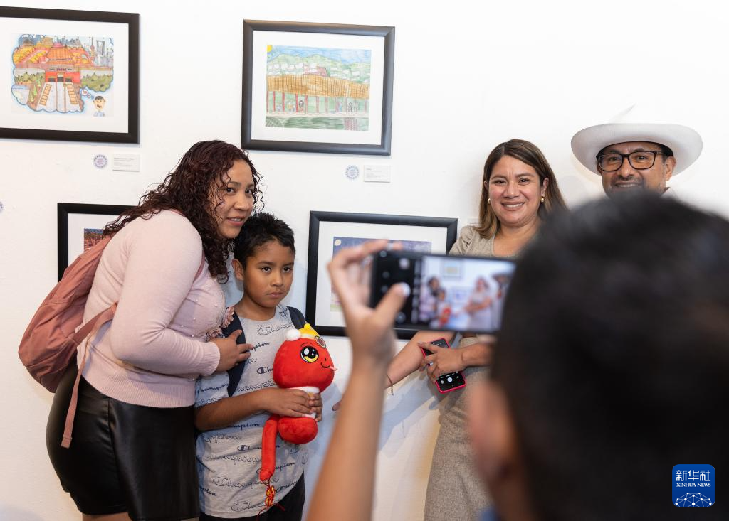 1月18日,在墨西哥首都墨西哥城举行的第十一届“我想象中的中国”儿童绘画比赛活动上,参赛者和家人手拿蛇年春节玩偶在画作前留影。
