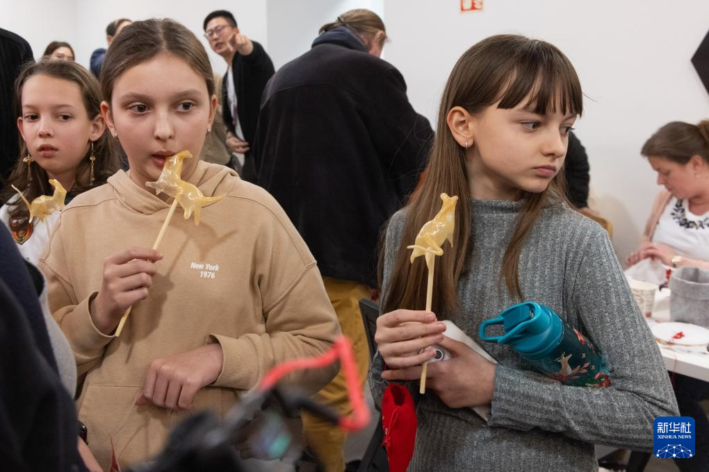 1月17日,在匈牙利布达佩斯,孩子们在“指尖上的非遗——中国文化体验日”为主题的2025“欢乐春节”活动上手举糖人。