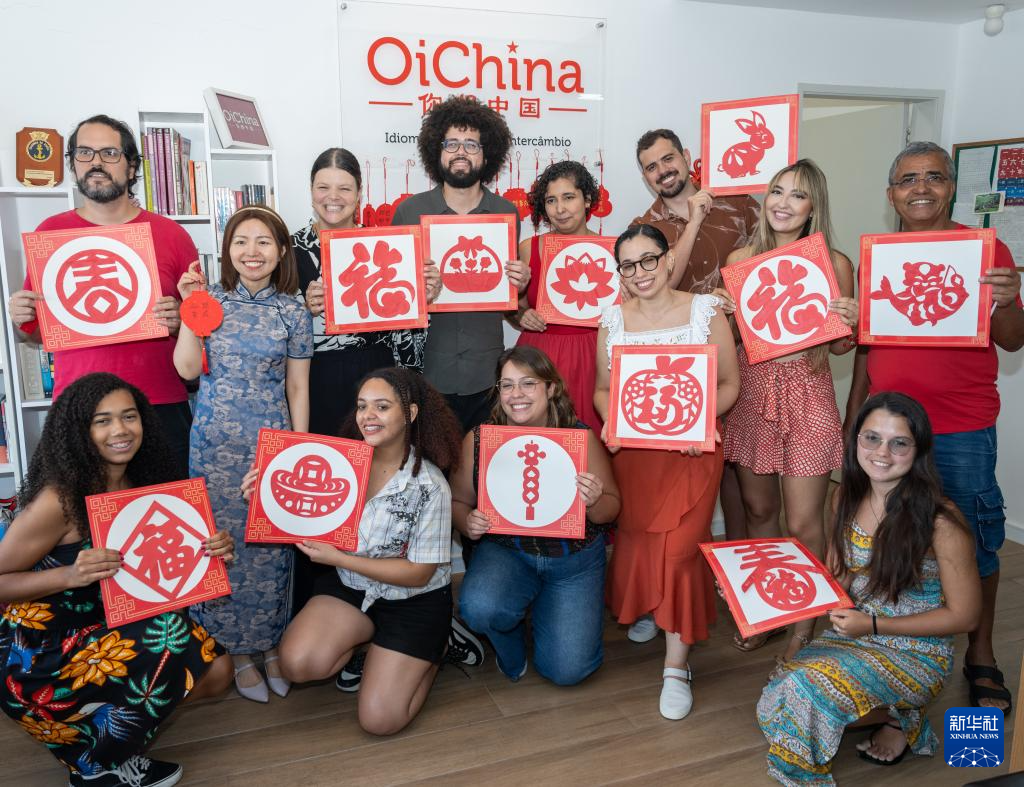 1月18日,人们在巴西里约热内卢举行的中国春节文化体验活动上展示他们一起制作的剪纸。