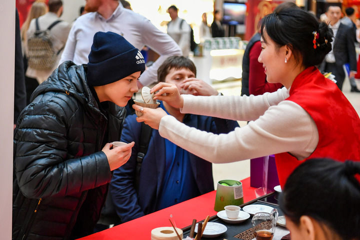 2025年1月28日,在俄罗斯莫斯科举行的新春庙会活动上,游客在感受茶文化。新华社记者 曹阳 摄