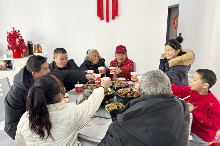2025年1月28日,湖南省华容县团洲乡团洲新村居民在新家吃团圆饭过大年。新华社发(吴巍伟 摄)