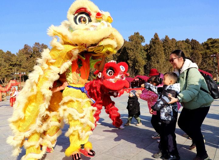 2025年1月28日,在河南南阳卧龙岗文化园内,市民欣赏舞狮表演。新华社发(高嵩摄)