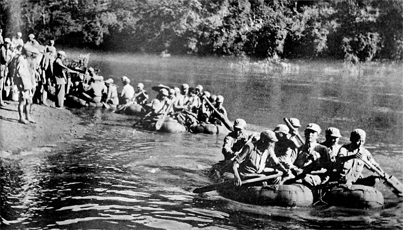 1944年5月,中国远征军将士用帆布舟渡过怒江发起反攻。