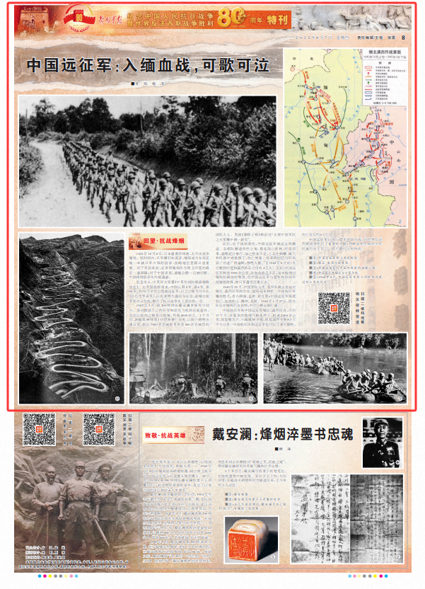 1942年3月,第200师师长戴安澜率部死守同古。面对数倍于己的日军和坦克飞机的狂轰滥炸,官兵以血肉之躯坚守阵地,歼敌4000余人。1个月后,新编第38师第113团奔袭仁安羌,以较小牺牲击溃日军,救出7000余名被困英军及500余名被俘的国际人士。英国《泰晤士报》称此役“实使中国军队之光荣簿中增一新页”。