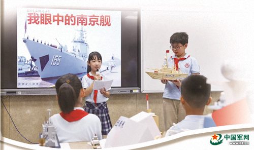 江苏省南京市后标营小学的学生,向来宁参加“南京舰优秀官兵看南京”活动的舰员代表介绍自己制作的南京舰模型。张林芳摄