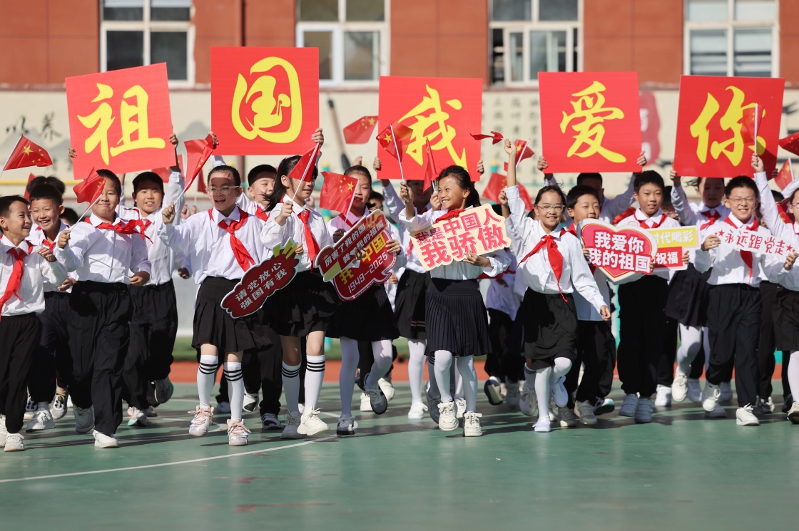9月25日,在山东省临沂市沂南县,第三实验小学的小学生们参加“祝福祖国”活动。新华社发(王彦冰 摄)