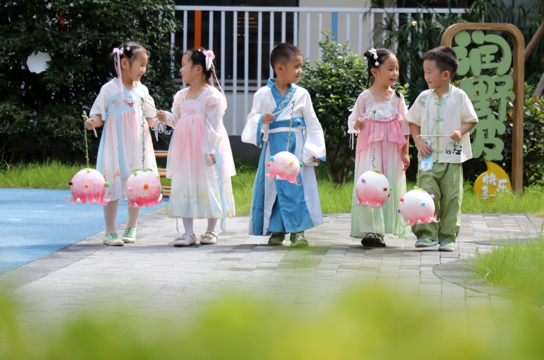 9月25日,在江苏省苏州市姑苏区平润实验幼儿园,小朋友提着自制中秋花灯欢乐游园。新华社发(杭兴微 摄)
