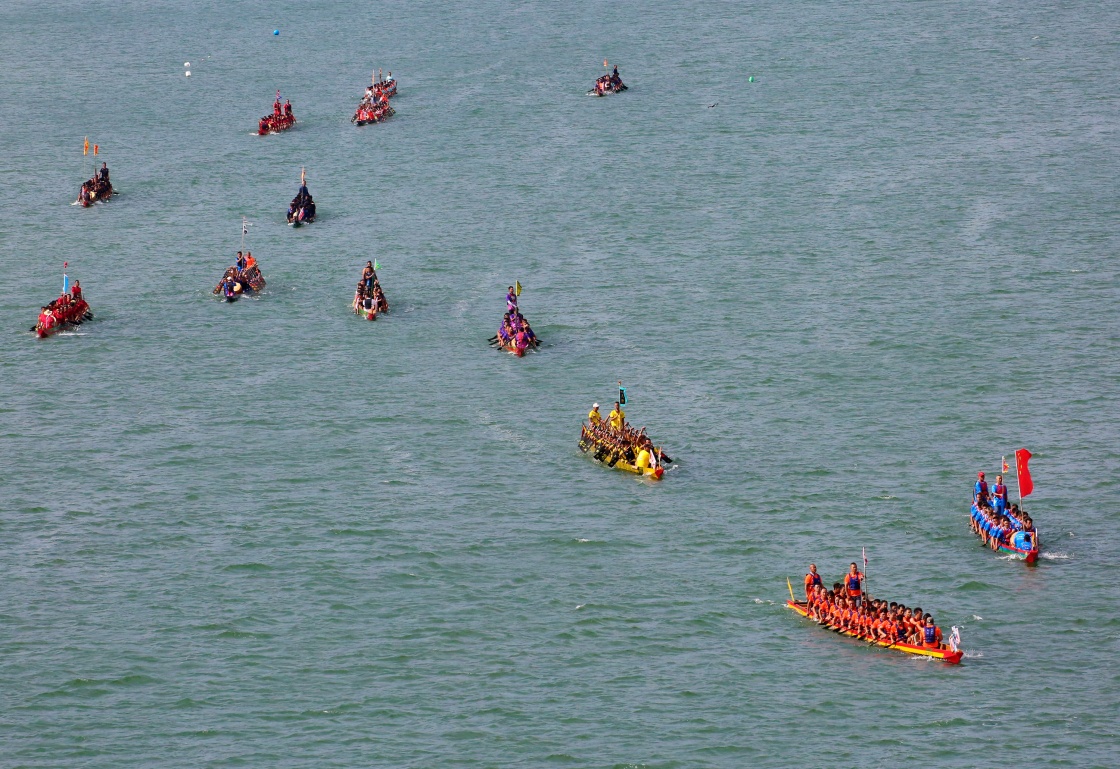 9月24日,在广西融水苗族自治县的融江河面上,龙舟队伍在角逐,喜迎国庆中秋佳节。新华社发(龙林智 摄)