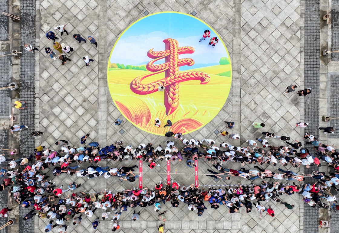 9月25日,在四川省华蓥市阳和镇祝家坝村,群众在“庆丰收·迎国庆·话中秋”活动中参加拔河比赛(无人机照片)。新华社发(邱海鹰 摄)