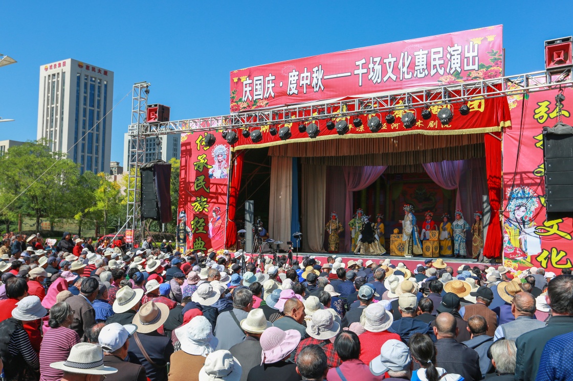 9月24日,在甘肃省平凉市绿地广场,演员在“庆国庆·度中秋”戏曲文化惠民演出现场表演。新华社发(吴希会 摄)