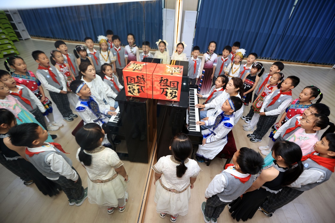 9月25日,在湖北省武汉市,未来实验小学师生演奏《我爱你中国》,迎接国庆节。新华社发(赵军 摄)
