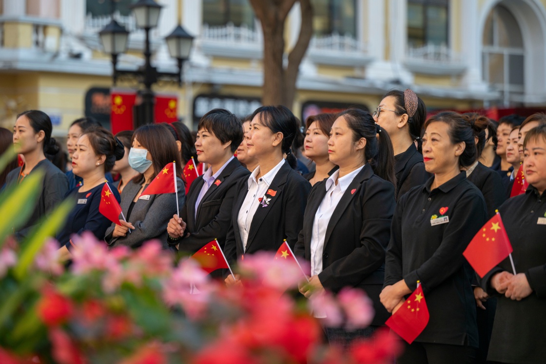10月1日,人们在哈尔滨市道里区中央大街参加升旗仪式。