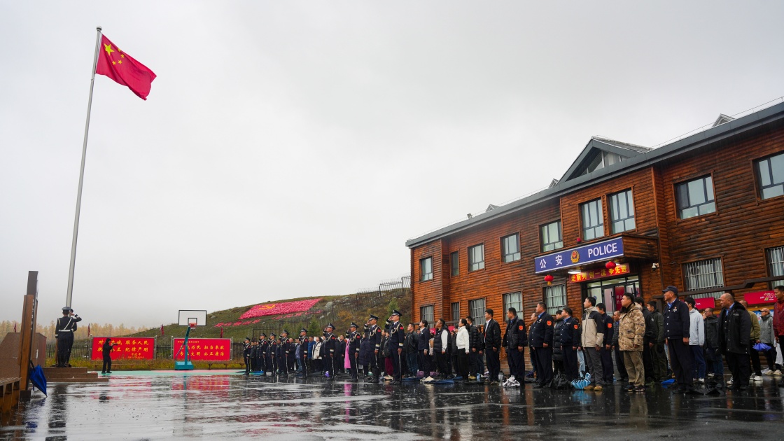 10月1日在新疆阿勒泰边境管理支队喀纳斯边境派出所拍摄的升旗仪式。