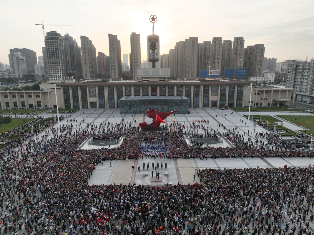 10月1日,人们在河北省石家庄解放广场参加升旗仪式(无人机照片)。
