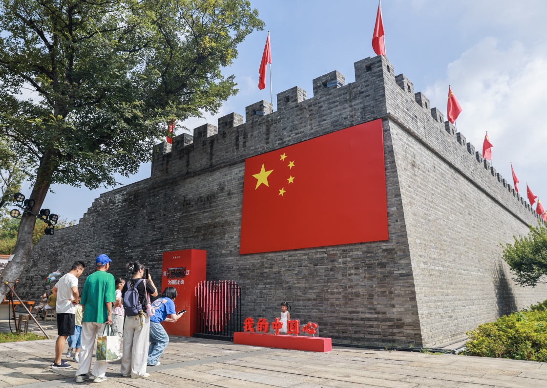 10月1日,在浙江嘉兴市南湖区建设街道子城城墙边,市民参加我为祖国心动打卡活动。
