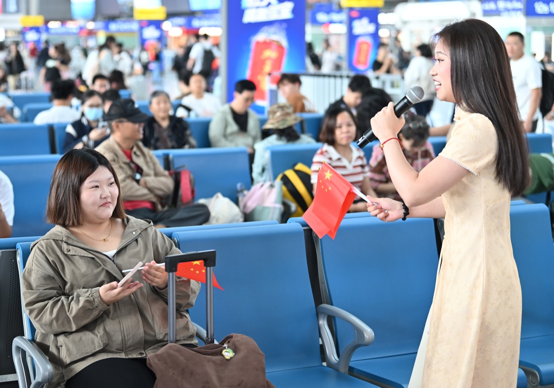 10月1日,铁路天津站在候车厅开展歌唱祖国音乐快闪活动。这是天津音乐学院的学生为旅客演唱歌曲。