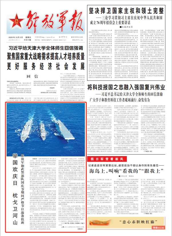 节日坚守战位,庆祝祖国华诞。万里长空,蓝天卫士驾机巡弋、鹰眸锐利;远海大洋,深蓝水兵劈波斩浪、剑指深蓝;大漠密林,导弹号手倚天执剑、引弓待发……官兵表示,在这举国同庆的日子里,一定把职责使命扛在肩上,时刻保持箭在弦上、引而待发的战备状态,把对祖国清澈的爱,化作枕戈待旦的实际行动,守护神州大地每一寸土地的安宁,请祖国和人民放心!