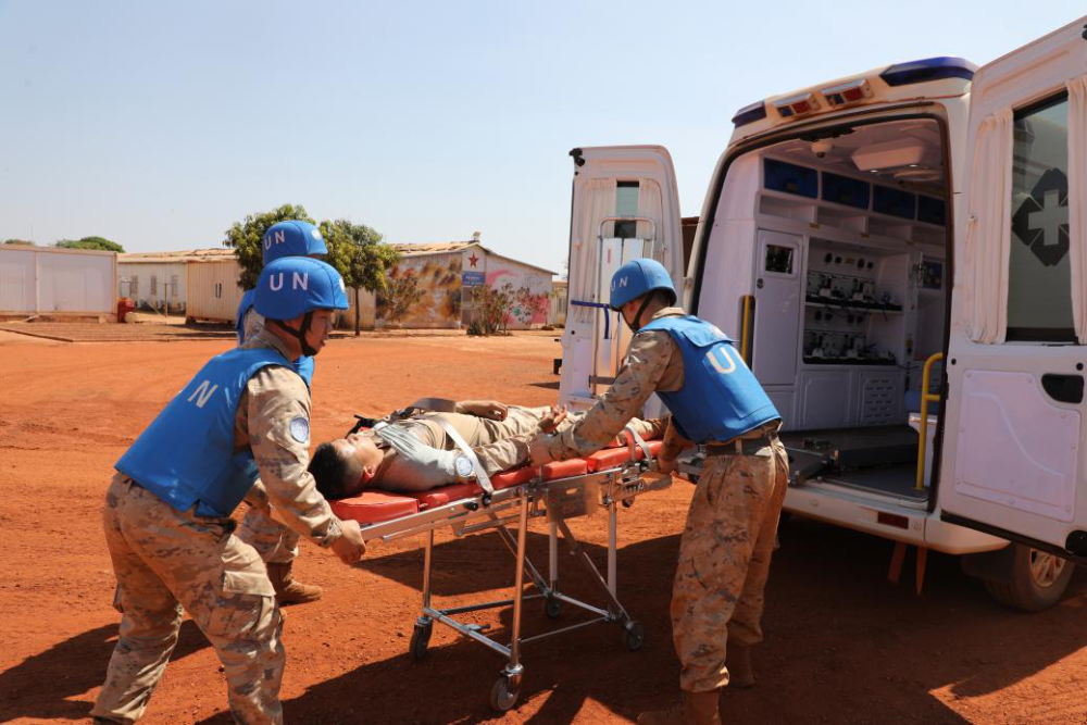 ↑维和工兵正进行医疗后送演练。张晓昆 摄