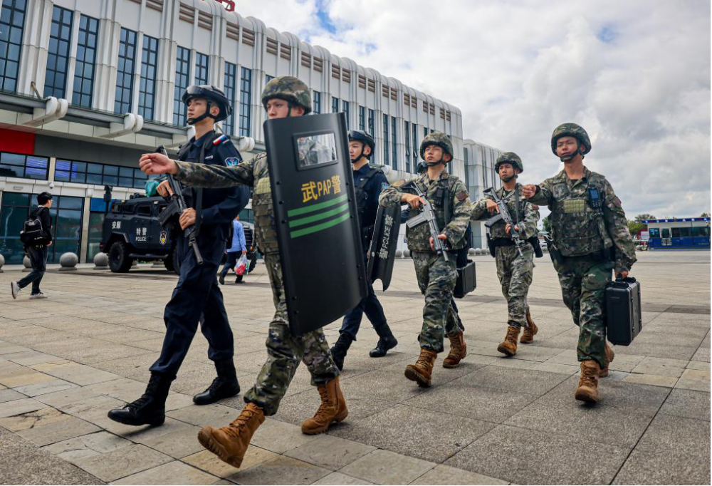 ↑官兵联合特警进行巡逻。陈地杰 摄
