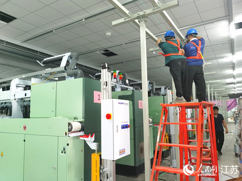 工人加紧安装调试碳中和智慧纺纱工厂设备。人民网记者 王继亮 摄