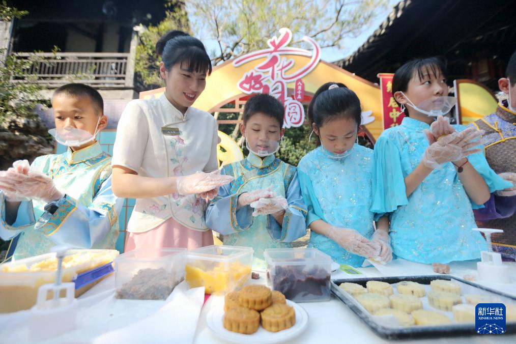 10月6日,在江苏省扬州市何园景区,小朋友们在工作人员的指导下体验制作月饼。新华社发(孟德龙摄)