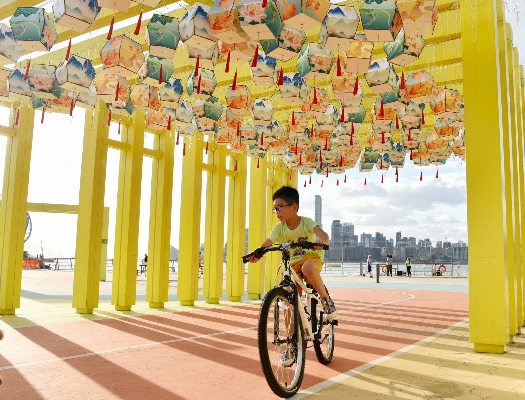9月27日,在香港东岸公园,一名男孩骑车从中秋彩灯下经过。新华社记者 陈铎 摄