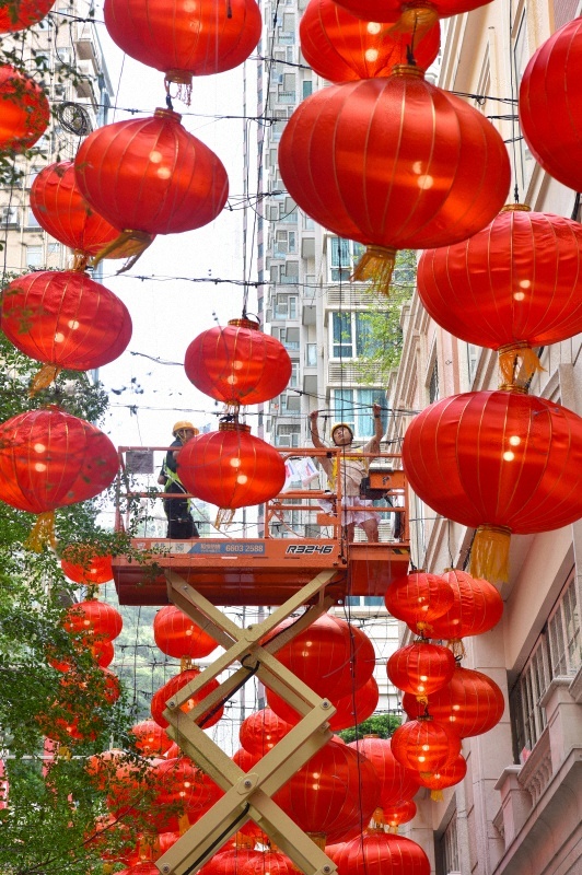 9月28日,工作人员在香港利东街悬挂大红灯笼。新华社记者 陈铎 摄