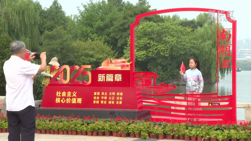 国庆期间,浙江嘉兴南湖景区迎来“红色旅游”热。景区精心设置“南湖1921列车”“我为祖国送祝福”等多个特色打卡点,游客们合影留念,定格与红船起航地“同框”的瞬间。