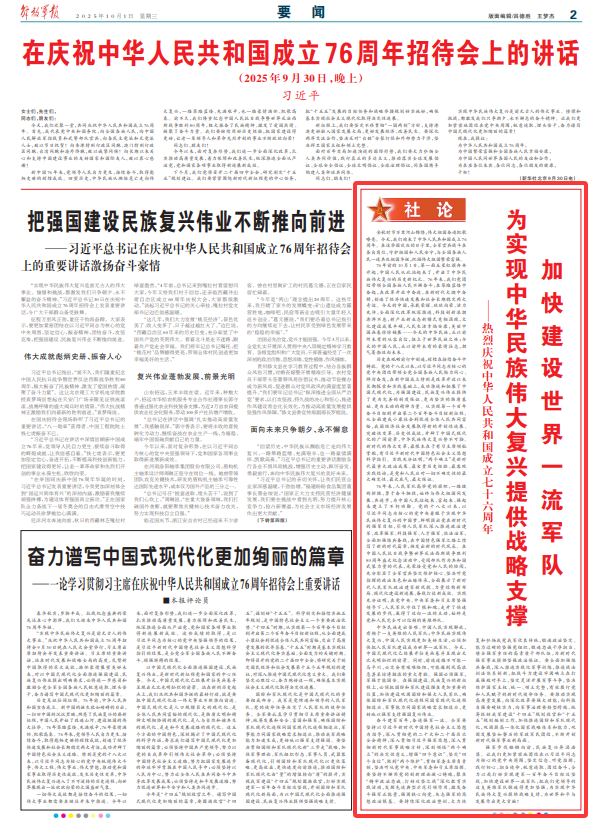 金秋时节万里河山锦绣,伟大祖国奋进凯歌嘹亮。今天,我们迎来了中华人民共和国成立76周年。在这举国欢庆的日子里,全军官兵战斗在各自岗位,守护祖国和人民安宁,与全国各族人民一道共庆祖国华诞,祝福伟大祖国繁荣富强。