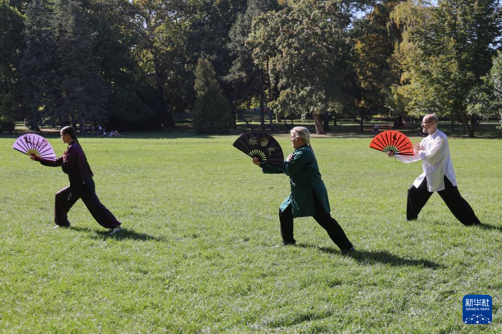9月21日,在匈牙利首都布达佩斯,匈牙利武术爱好者进行太极扇表演。新华社发(弗尔季·奥蒂洛摄)