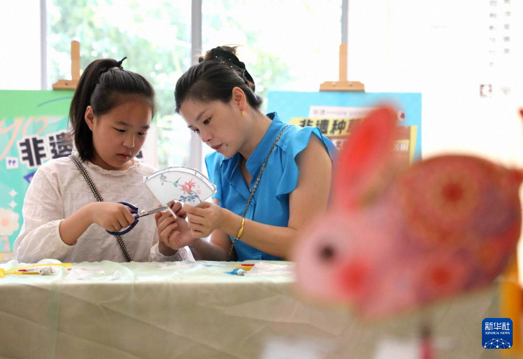 10月6日,在山东省滕州市博物馆,小朋友制作“风车转花灯”。新华社发(李志军摄)
