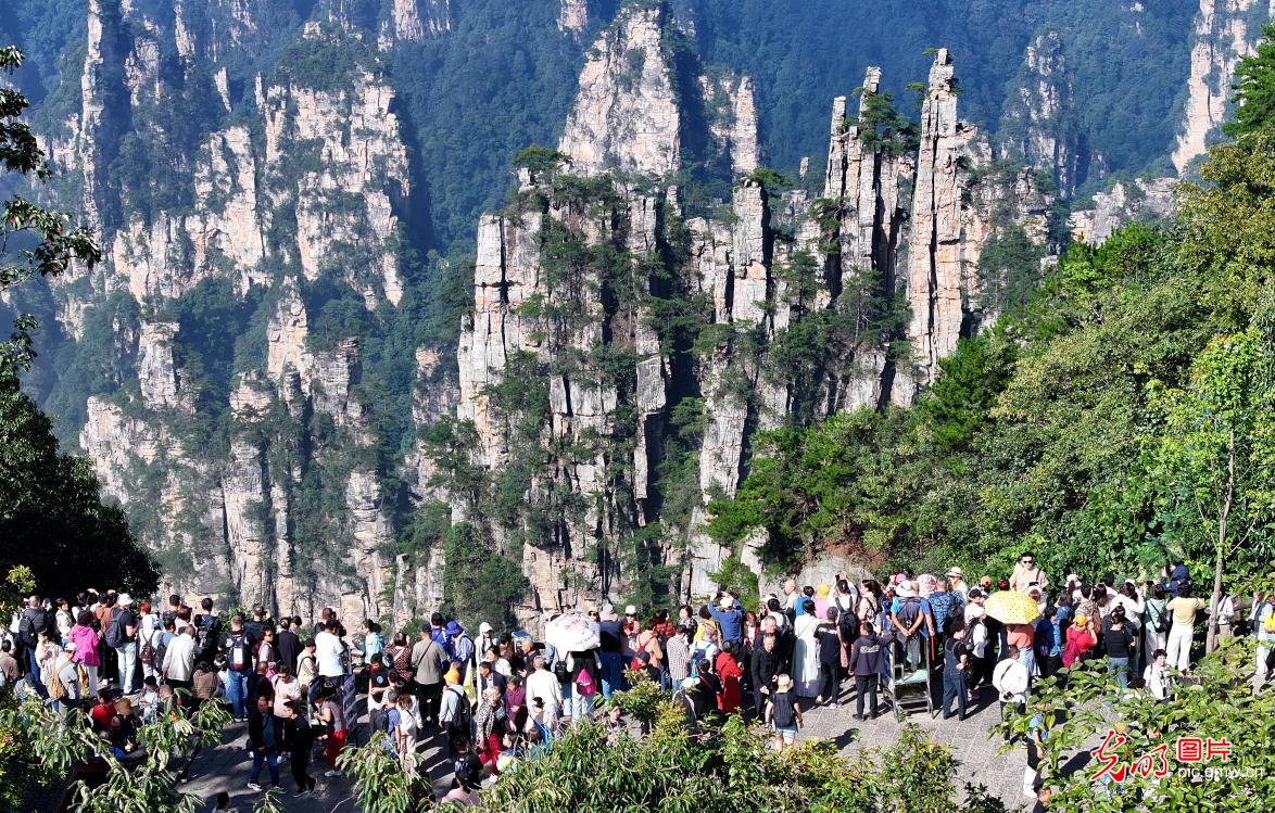 2025年9月24日,游人在张家界国家森林公园天子山景区游览。国庆、中秋双节临近,湖南张家界国家森林公园天子山、十里画廊等景区迎来"秋游黄金季",秋高气爽的宜人气候与奇美的自然风光相得益彰,吸引了中外游客前来观光游览。(吴勇兵摄/光明图片)