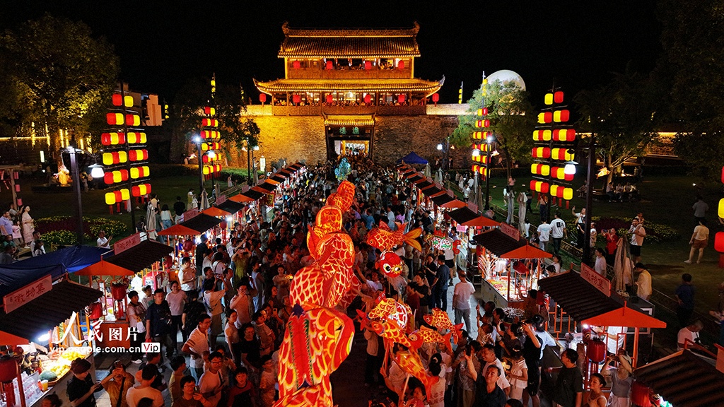 10月6日,游客在安徽歙县徽州古城观赏非遗鱼灯巡游表演,欢度中秋佳节。汪建林摄(人民图片网)