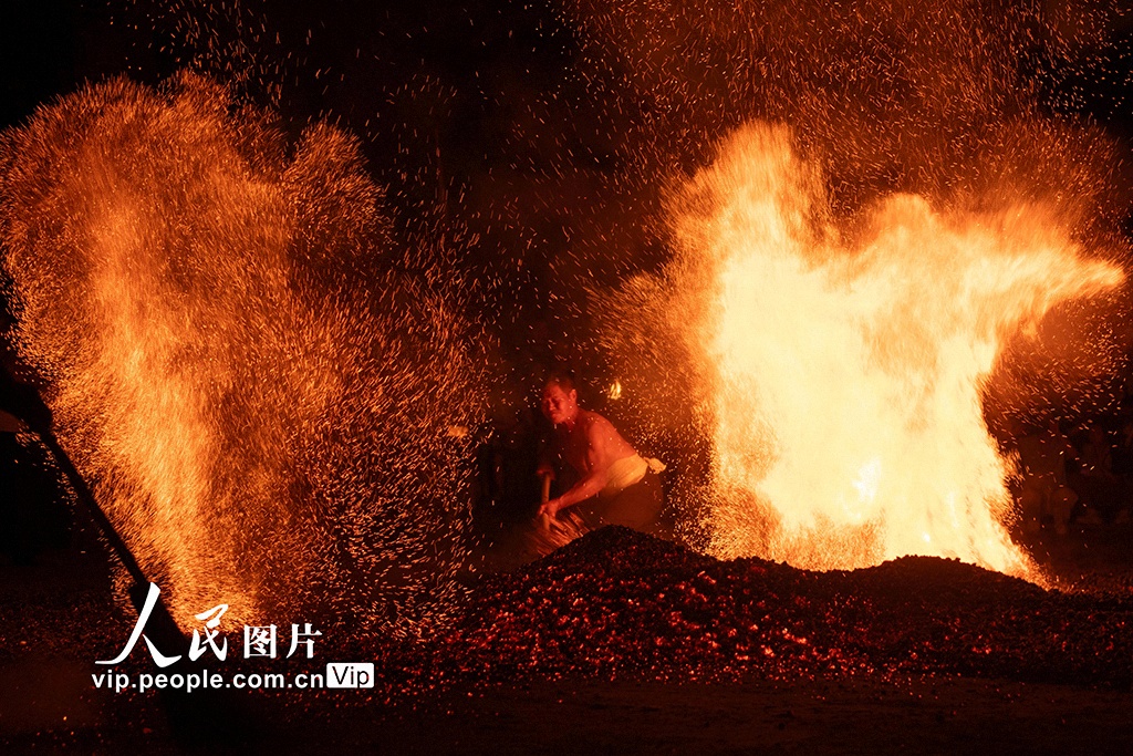 10月6日晚,浙江省金华市磐安县双峰乡,村民在表演“炼火”民俗活动,欢庆中秋佳节。张辉摄(人民图片网)