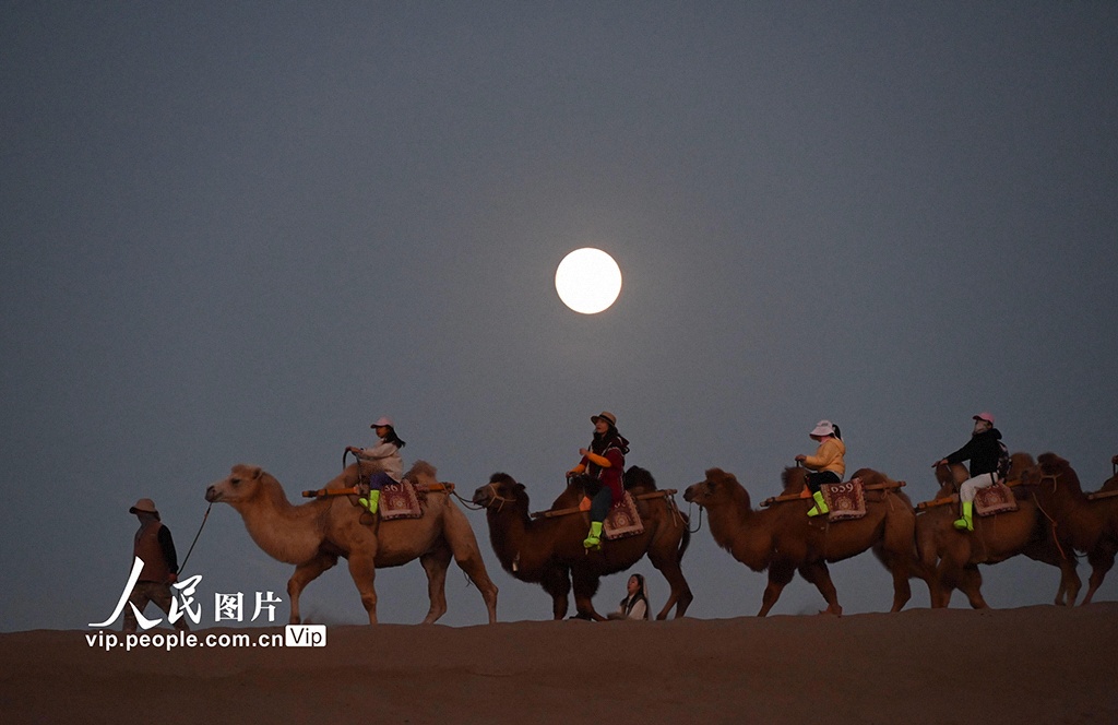 10月6日晚,游客在甘肃省敦煌市鸣沙山月牙泉景区骑骆驼赏明月。张晓亮摄(人民图片网)