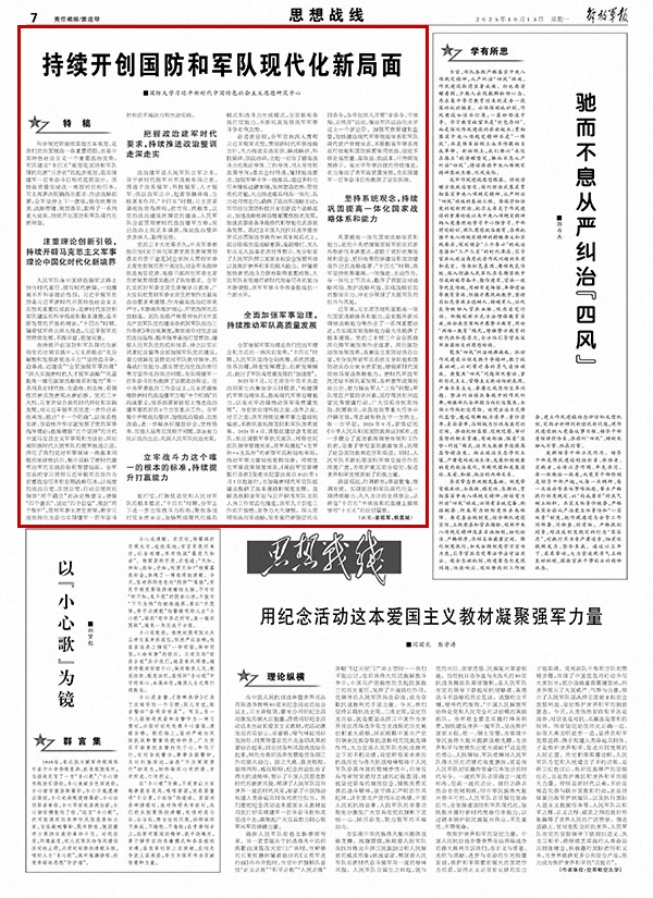 在持续开创国防和军队现代化新局面的壮阔实践中,习主席提出“充分解放和发展新质战斗力”“坚持边斗争、边备战、边建设”“全面加强军事治理”“深入实施新时代人才强军战略”“巩固提高一体化国家战略体系和能力”等一系列具有时代性、创造性、标志性、引领性的新思想新观点新论断。党的二十大后,习主席结合新的时代特征和实践发展,对习近平强军思想进一步作出系统阐发,提出“十一个明确”,以体系性创新、创造性升华丰富发展了党的军事指导理论;提炼概括“五个坚持”的当代中国马克思主义军事观和方法论,深刻阐明新时代人民军队的强军胜战之道,深化了我们党对军事领域一些基本问题的规律性认识,集中反映了新时代建军治军的实践经验和智慧结晶。全军官兵把学习贯彻习近平强军思想作为首要政治任务和长期战略任务,以高度的政治自觉、思想自觉、行动自觉深刻领悟“两个确立”的决定性意义,增强“四个意识”、坚定“四个自信”、做到“两个维护”,贯彻军委主席负责制,将学习成效转化为奋力实现建军一百年奋斗目标的不竭动力和生动实践。