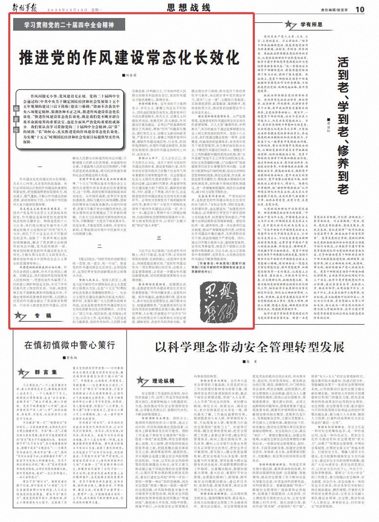 作风问题无小事,党风建设无止境。党的二十届四中全会通过的《中共中央关于制定国民经济和社会发展第十五个五年规划的建议》(以下简称《建议》)强调:“锲而不舍落实中央八项规定精神,狠刹各种不正之风,推进作风建设常态化长效化。”推进作风建设常态化长效化,既是我们党不断开辟自我革命新境界的重要法宝,也是全面从严治党的重要组成部分。我们要认真学习贯彻党的二十届四中全会精神,以“常”的韧劲、“长”的恒心,扎实推进党的作风建设常态化长效化,为实现“十五五”时期国民经济和社会发展目标提供坚实作风保障。
