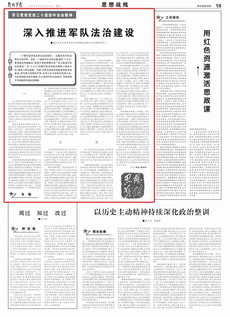 一个现代化国家必然是法治国家,一支现代化军队必然是法治军队。党的二十届四中全会审议通过的“十五五”规划建议明确提出“推进军事治理现代化”“深入推进军队法治建设”,为“十五五”时期军队法治建设指明了前进方向、提供了根本遵循。当前,军队法治建设面临难得的发展机遇,担负艰巨的使命任务,必须立足全面依法治国大局,全面贯彻依法治军战略,深入推进军队法治建设,为推进强军事业提供坚强法治保障。