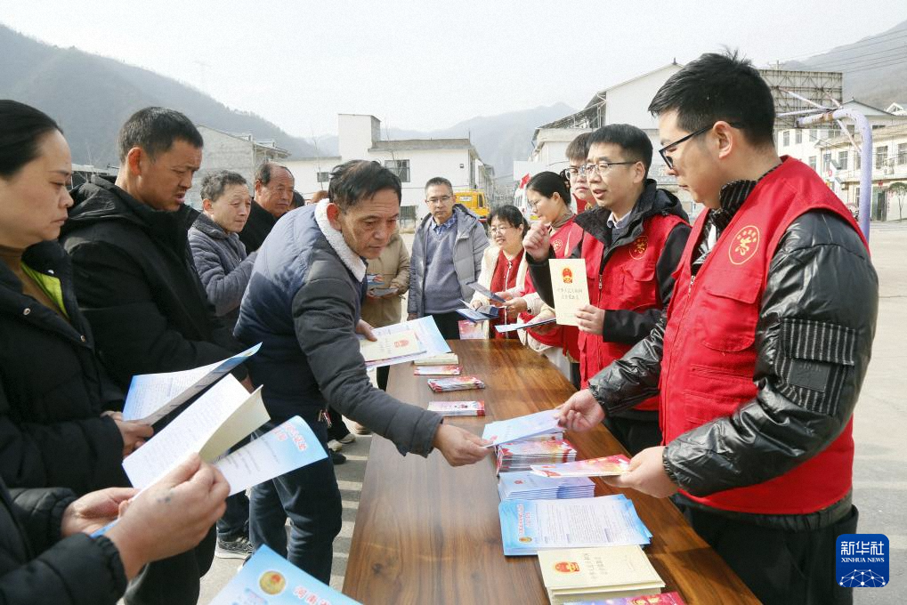 12月2日,在河南省洛阳市汝阳县付店镇马庙村,县法律援助中心、公正处、司法所志愿者给群众讲解宪法知识。新华社发(康红军 摄)