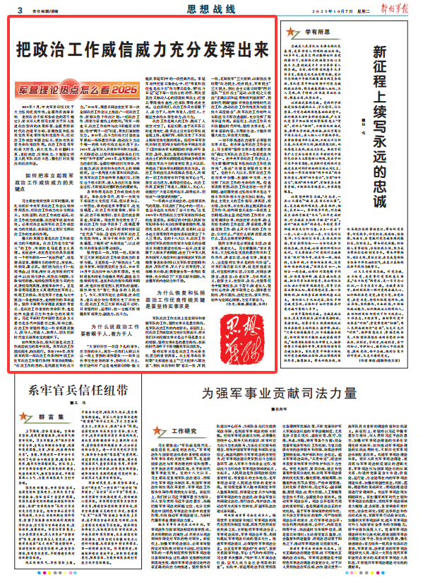 习主席在视察空降兵军时强调,要扎实抓好中央军委政治工作会议精神贯彻落实,把政治工作威力充分发挥出来。实践证明,政治工作威信越高,政治工作威力就越强,政治建军就越有成效。必须把准立起我军政治工作威信威力的关键点,在新征程上更好发挥政治工作的生命线作用。