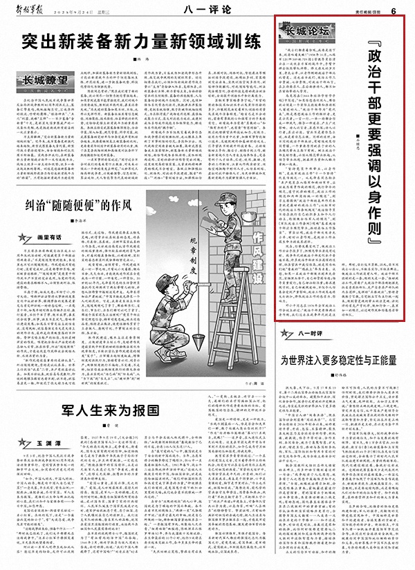“坚持党员干部带头、以身作则”,是我军政治工作“十一个坚持”优良传统之一。从毛泽东同志指出“共产党员在八路军和新四军中,应该成为英勇作战的模范,执行命令的模范,遵守纪律的模范,政治工作的模范和内部团结统一的模范”,到习主席强调“政治干部的表率作用本身就是最好的政治工作”;从红军时代的政治工作条例规定“政治指导员不论在执行自己的职务上和个人行动上,均须做全体军人的模范”,到《军队政治工作条例》明确“基层政治干部应当模范带头,抓好具体工作落实”。事实证明,政治干部处处身先士卒、时时以身作则,是政治工作永葆生命力的底层逻辑。