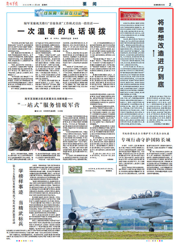 在中央军委政治工作会议上,习主席对新征程上推进政治建军需要抓好的6个方面重点工作进行部署,将“增强思想改造的自觉性和彻底性”放在首位,凸显了思想改造对推动政治建军走深走实、确保人民军队始终纯洁光荣的重要作用。这不仅精准把脉问题症结,更指明了解决问题的正确方向、遵循和方法。持续深化政治整训,就必须发扬彻底的自我革命精神,着力将思想改造进行到底,通过全面的、坚决的“思想大扫除”,不断剔除思想杂质、清除私欲杂念,深挖根源、触动灵魂,让正确的、先进的、纯洁的思想占据高地、坚不可摧。