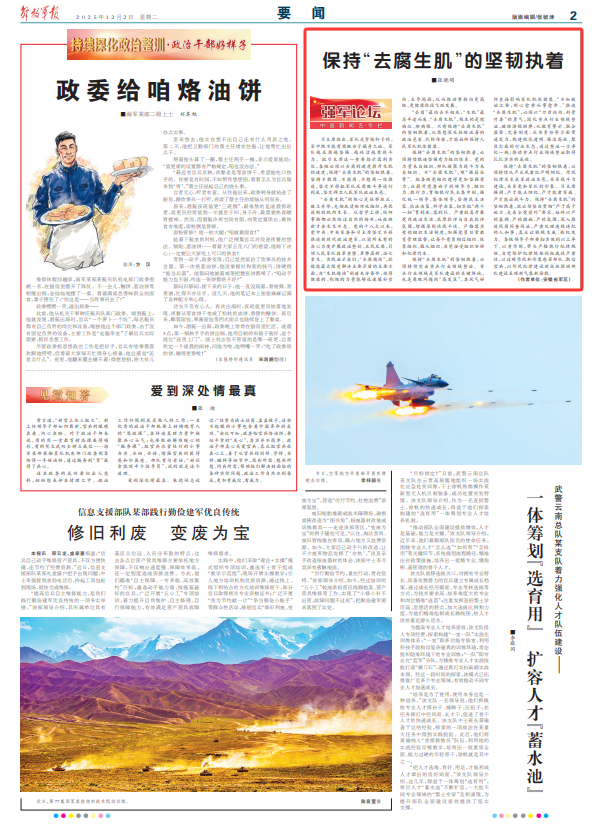 “去腐”最怕去不彻底,“生肌”最忌半途而废。“去腐生肌”,根本的是挖病灶、除病根。只有保持“去腐生肌”的坚韧执着,从思想深处祛除流毒的政治危害、代际传染,才能始终保持人民军队肌体健康。