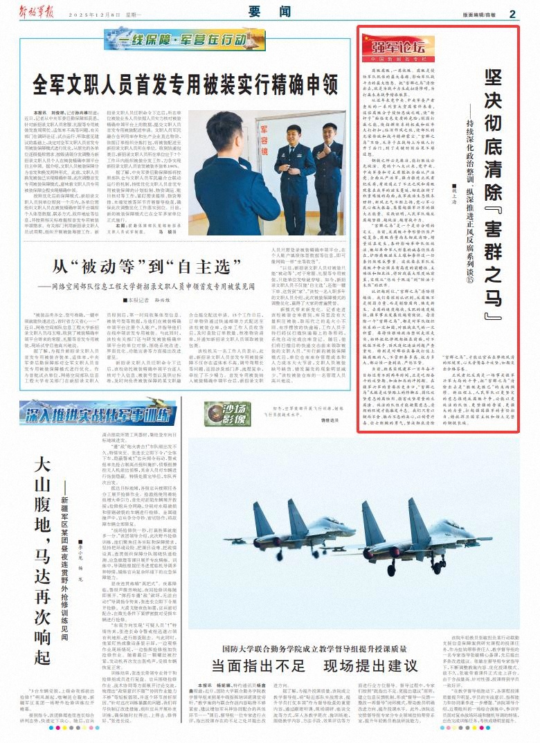 正风肃纪反腐是一场事关强军兴军大局的斗争,把“害群之马”清除出去是“胜敌先胜己”的未雨绸缪。新征程上,人民军队以更坚定的意志推进反腐败斗争,必能以更纯洁的队伍、更坚强的脊梁、更强大的力量,扛起强国强军的责任担当,铸就捍卫国家主权和领土完整的钢铁长城。