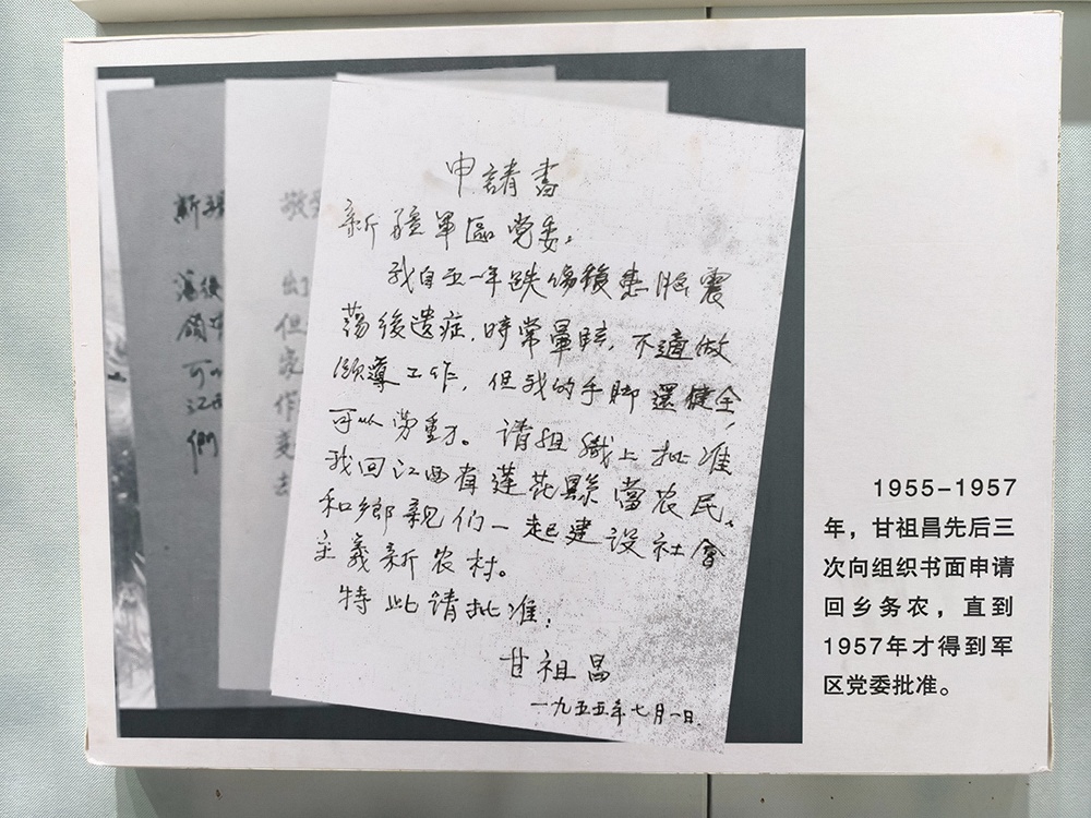 甘祖昌1926年投身革命,1927年加入中国共产党。参加过第一至第五次反“围剿”和二万五千里长征。抗日战争时期,转战华北,征战湘粤;解放战争时期,出秦入陇,穿戈壁进新疆。身经百战的他头部受过三次重伤,1951年遭遇车祸后,自觉身体条件无法胜任工作岗位,先后向上级递交三次报告,要求回乡务农。