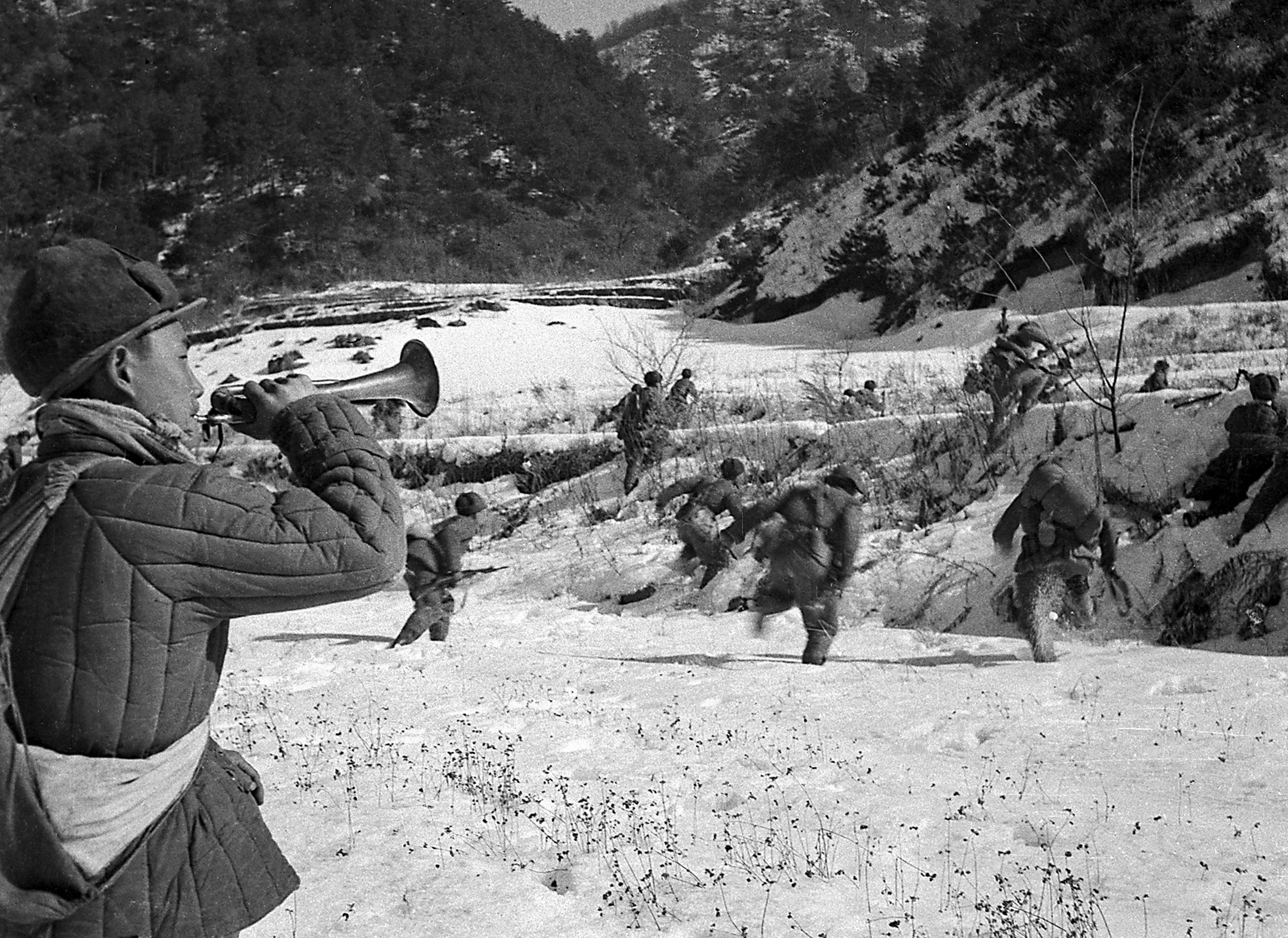 抗美援朝战场,志愿军某部司号员吹响冲锋号,官兵向敌发起冲击。