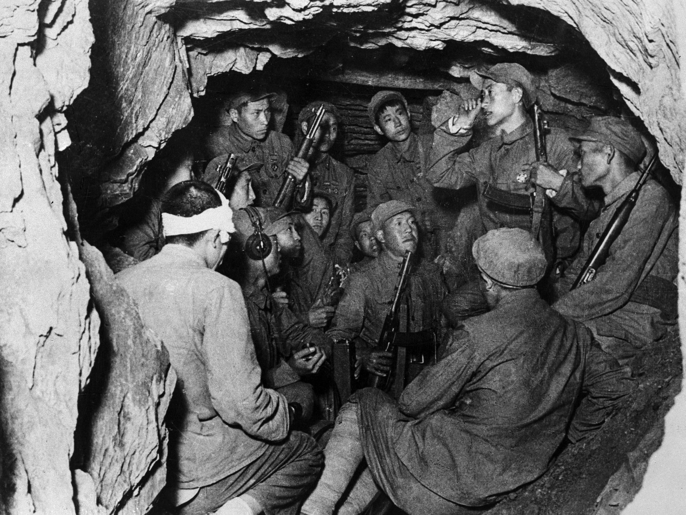 抗美援朝战争期间,某部党员在坑道中召开党员大会,决心坚守阵地。