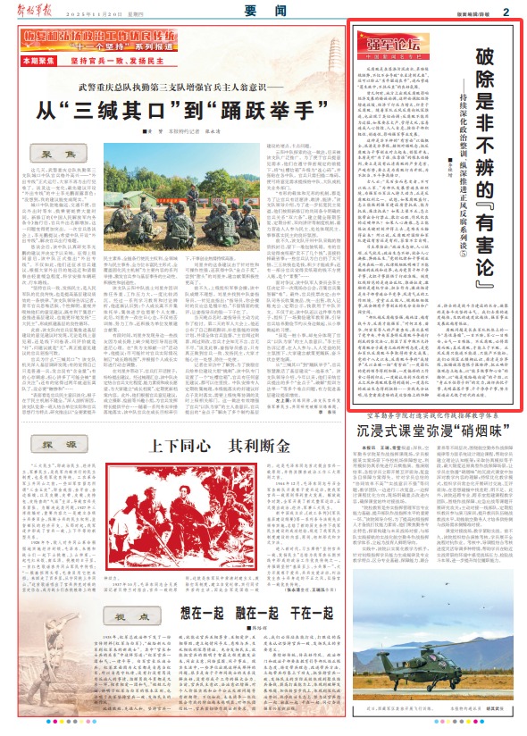 腐败问题是长在军队肌体上的一个“恶性毒瘤”,一日不除,军心一日难安,士气一日难振。不反腐败,必将因腐而败;真反腐败,才能立于不败。正风反腐只能进不能退、只能严不能松,我们必须匡正模糊认识、廓清是非界限,把错误思想根子拔除掉、把正确价值观念立起来,以“能多做事即心安”的胸怀,以“越是艰险越向前”的干劲,以“身正不怕影子斜”的定力,满怀热忱干事、光明磊落干事、干干净净干事,努力创造出无愧于时代的业绩。