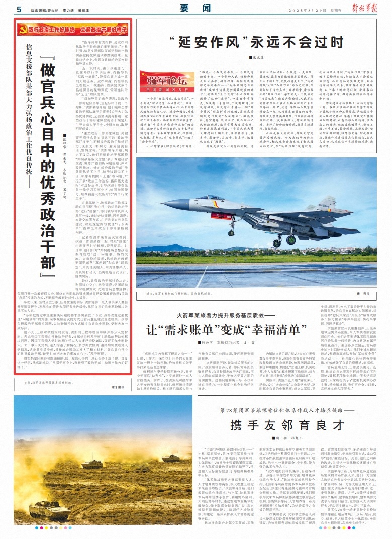 “肖指导员的出色表现,是政治干部树起好形象、立起好样子的一个缩影。”该部领导介绍,他们组织全体政治干部认真学习贯彻《关于大力弘扬优良传统、全面肃清流毒影响 重塑政治干部形象威信的若干规定》,引导大家实干在先、冲锋在前,取得明显成效。