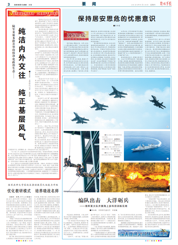 近日,该旅全员全装奔赴陌生地域开展训练。训练中,参训政治干部紧贴任务进程带头冲锋,在他们的示范带动下,官兵心往一处想、劲往一处使,围绕重难点课目展开专攻精练,多项战法训法得到有效检验。该旅某连新任指导员感慨地说:“践行政治工作好传统、立起政治干部好样子,关键是要时刻绷紧政治纪律和政治规矩这根弦。只有积极营造清清爽爽、规规矩矩、干干净净的内部关系,在服务保证能打胜仗中发挥政治工作威力,才能持续提升部队凝聚力、向心力、战斗力。”